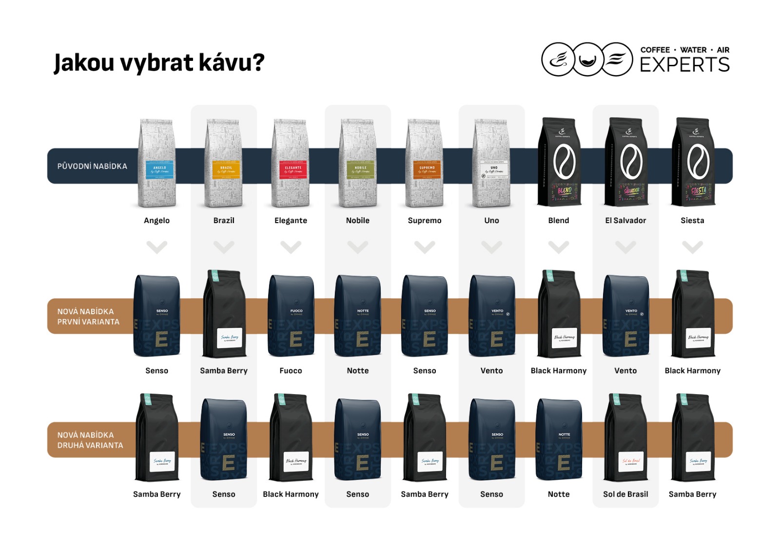Určitě se neváhejte obrátit na Customer Care manažerku, která se stará o Vaši společnost. Společně s našim baristou Vám poradí, který druh kávy by Vám vyhovoval, ať už z pohledu chuťových nebo ekonomických preferencí. V neposlední řadě je možné se vzájemně dohodnout na zorganizování ochutnávky na našem showroomu nebo v sídle Vaší společnosti. Základním vodítkem ve vztahu k výběru kávy z nové nabídky můžete použít i grafiku níže.